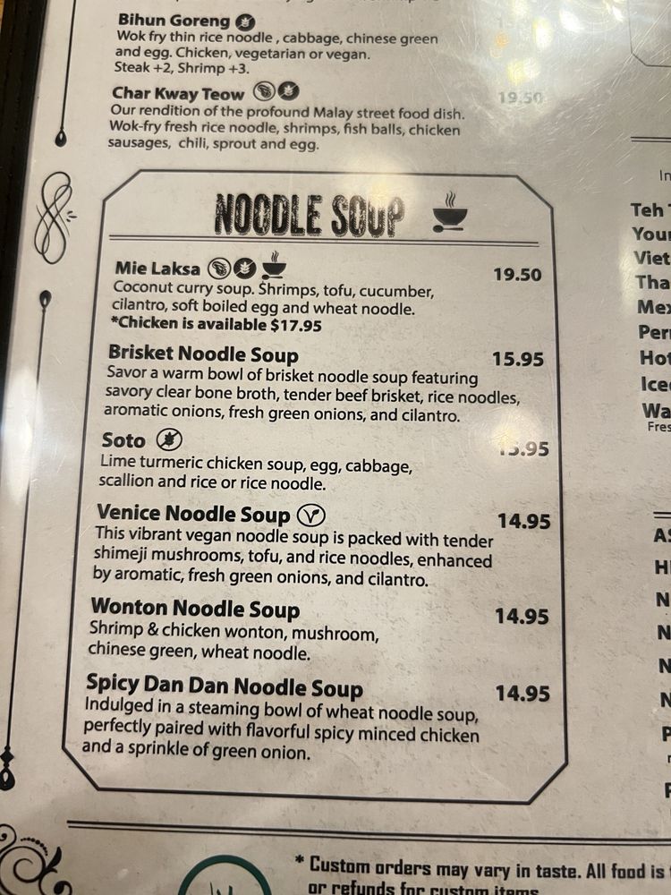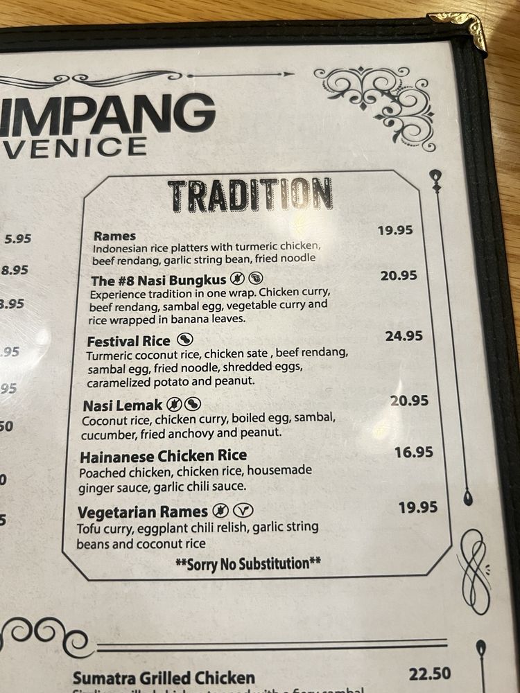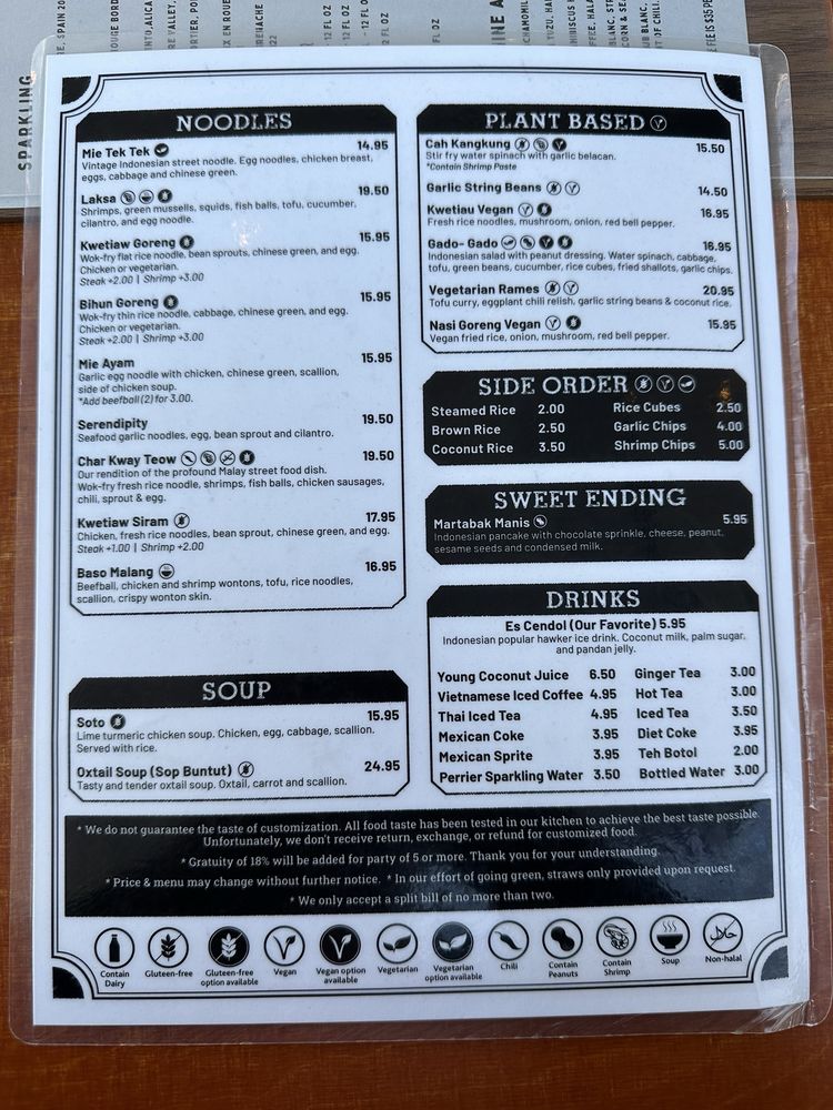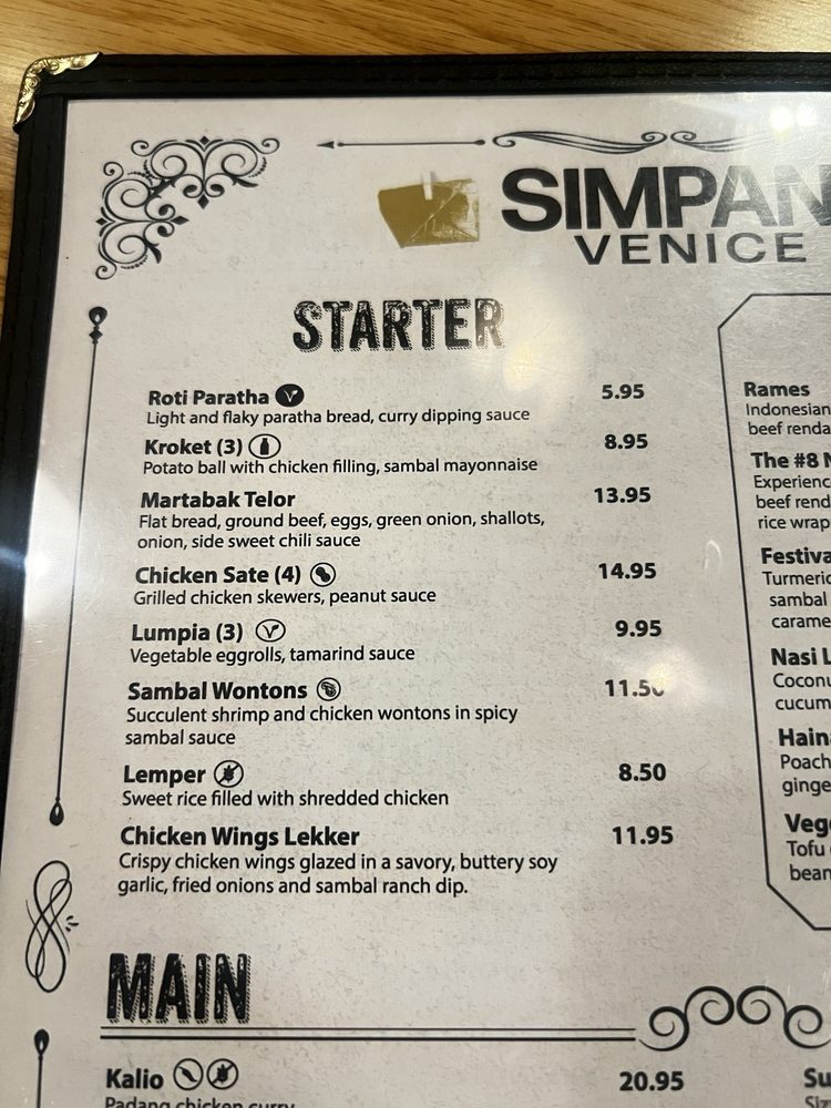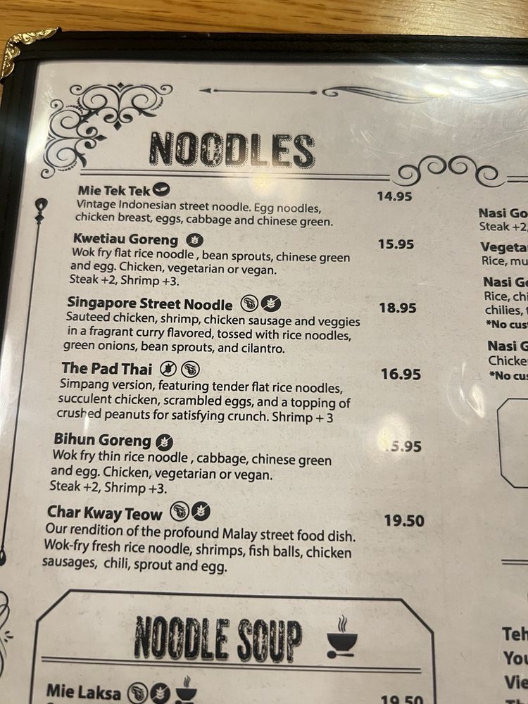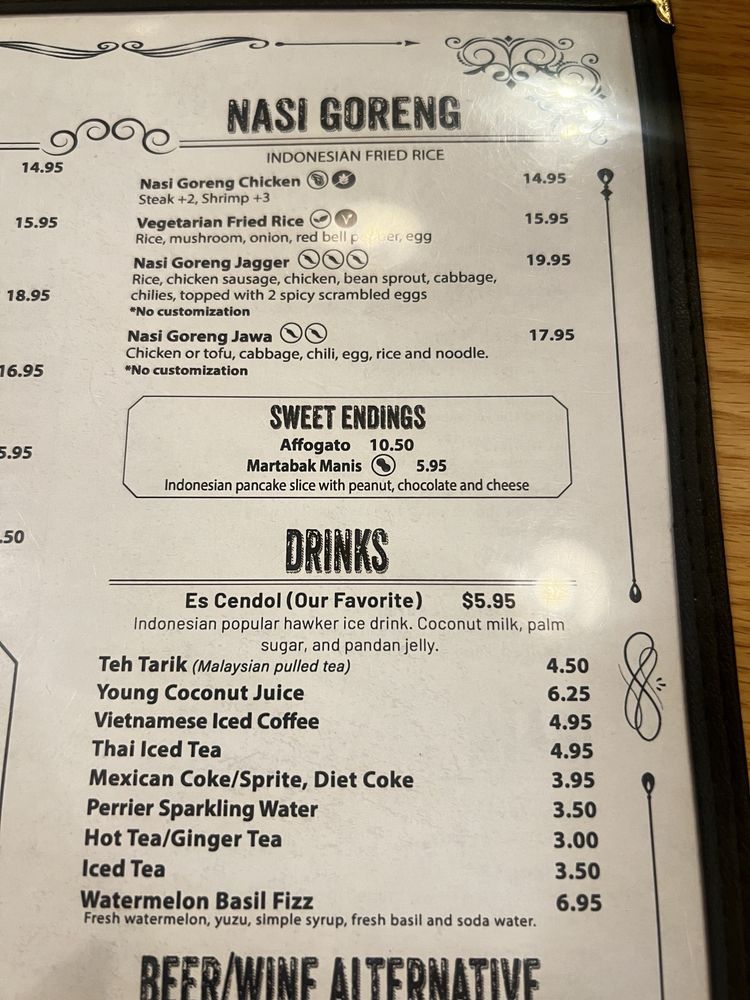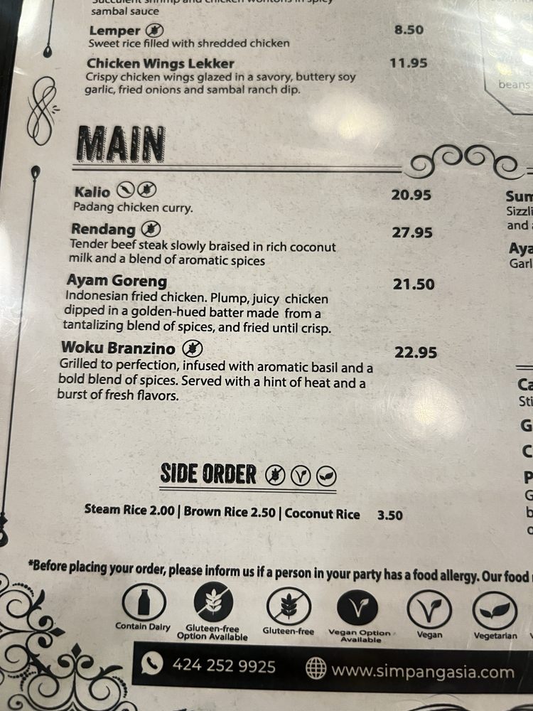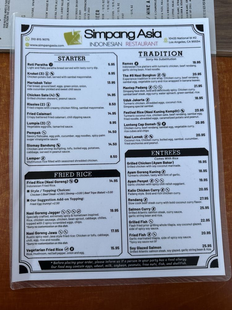 Simpang Asia is a Halal restaurant located in Los Angeles, offering a diverse menu with options for both vegans and non-vegetarians. Known for its blend of Thai and Indian flavors, the dishes are generously portioned and flavorful. Customers praise the signature toasted caramel tea drink and commend the establishment for catering to a variety of dietary preferences. While some reviewers note challenges with parking and service speed, the overall dining experience is highly rated. Standout dishes include the Soy Glazed Salmon and Indonesian specialties like Nasi Goreng and Penang, showcasing excellent flavor profiles and expert preparation. The cozy ambiance makes it ideal for intimate dinners or casual gatherings with friends. With a range of amenities like outdoor seating, free Wi-Fi, and happy hour specials, Simpang Asia promises a memorable dining experience for those seeking authentic Indonesian cuisine in LA.